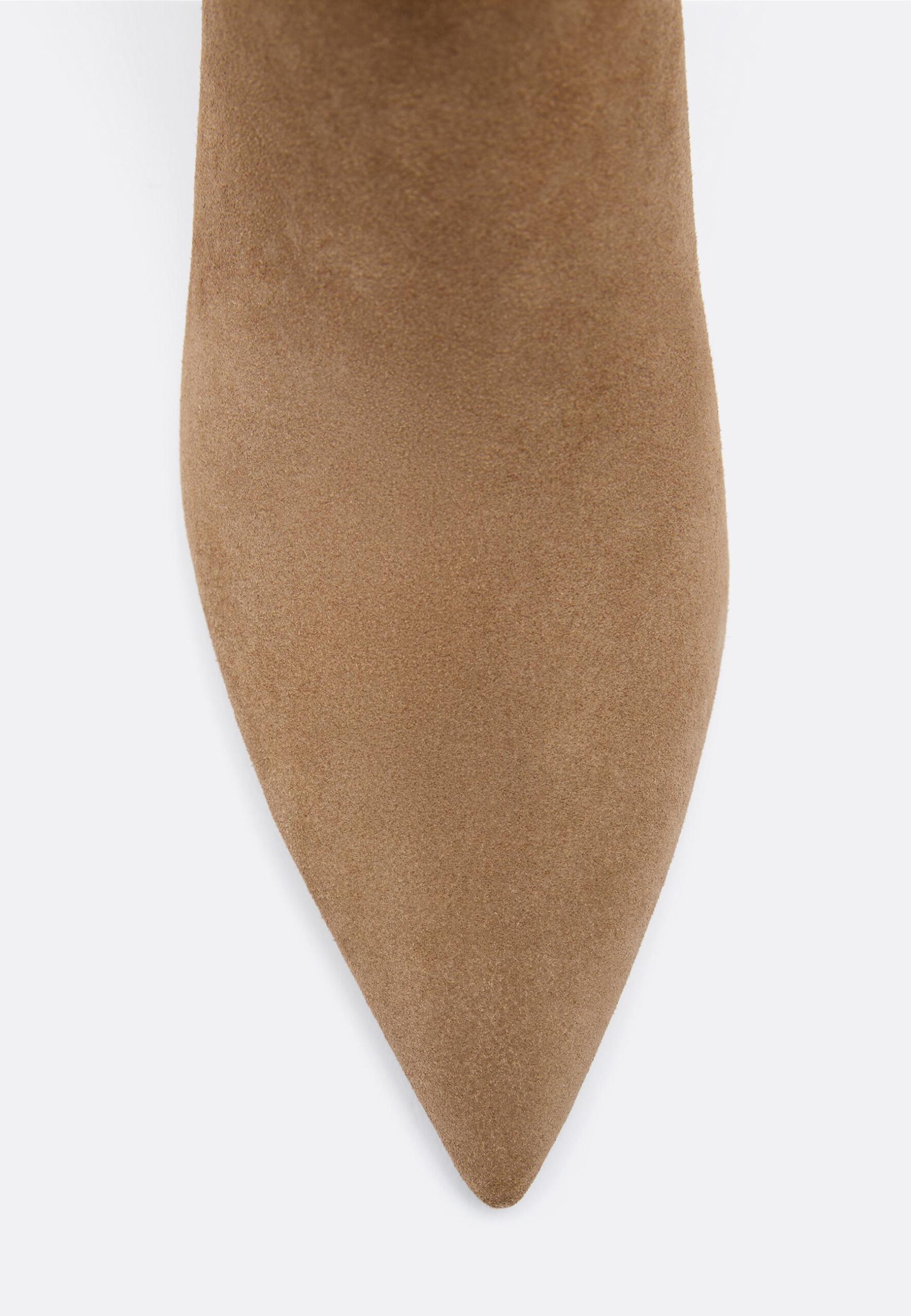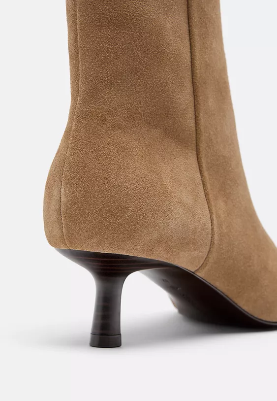 Botines de tacón kitten de piel con caña asimétrica. Acabado en punta. Disponible en color beige. Altura: 5 cm