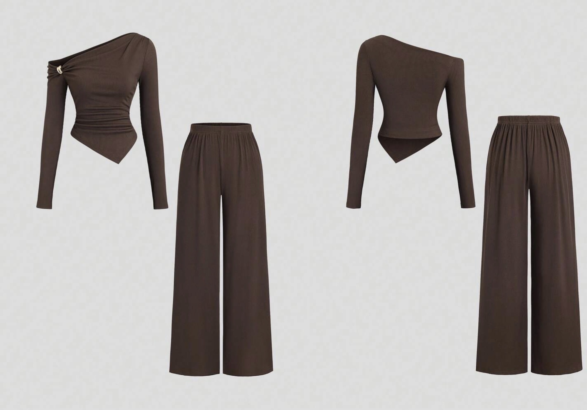 Conjunt de 2 peces bàsic i versàtil per a dona per a tardor/hivern, amb top de màniga llarga amb espatlles obertes i decoració metàl·lica asimètrica, i pantalons rectes i amples de cama casual