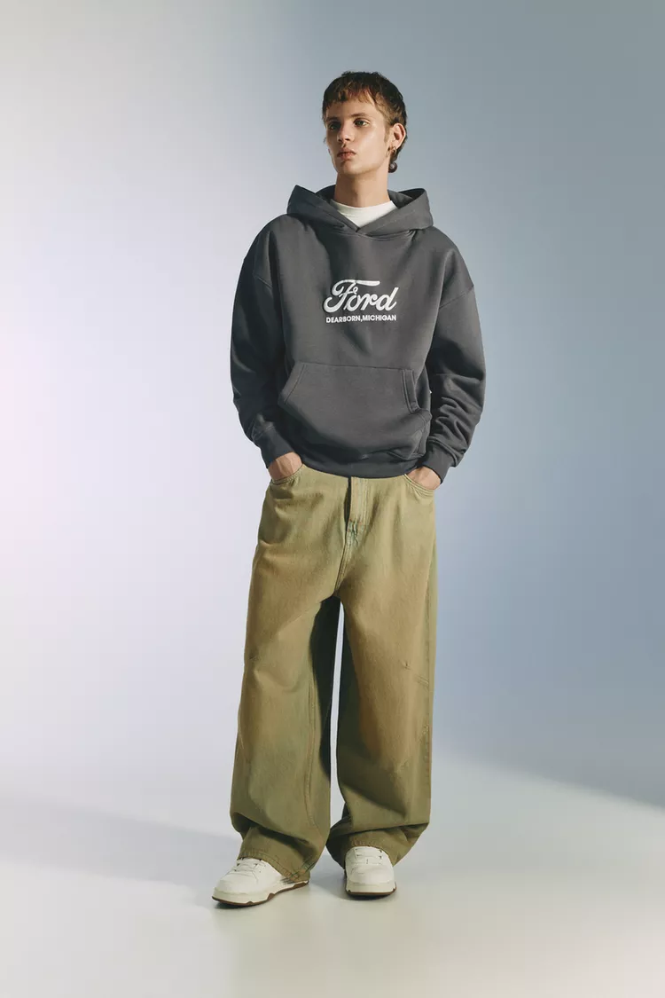 Sudadera gris licencia Ford, con capucha, bolsillo tipo canguro, gráfico en contraste en la espalda y en la parte delantera y de confeccionada en algodón.